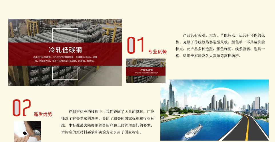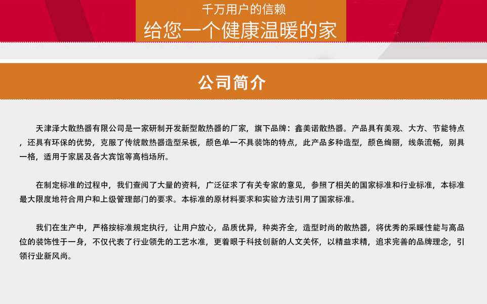 天津泽大散热器有限公司(旗下品牌:鑫美诺散热器)是一家研制开发新型散热器的厂家,它是传统散热器的升级换代产品,具有美观、大方、节能特点,还具有环保的优势。克产品多种造型,颜色绚丽,线条流畅,别具一格,适用于家居及各大宾馆等高档场所。